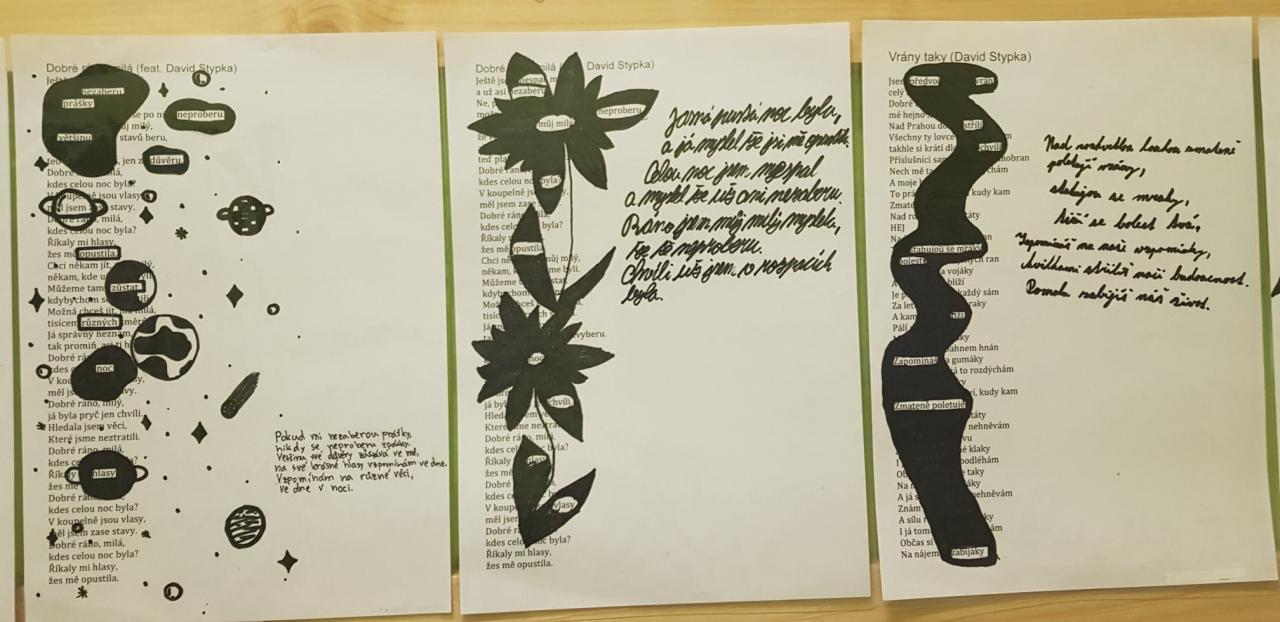Žáci 2. stupně naší školy dostali do rukou písňové texty nedávno zesnulého zpěváka Davida Stypky. Měli za úkol ohraničit deset slov, která je v textu nejvíce oslovila, u kterých se zastavili, která je nutila zamyslet se. Okolí těchto slov pak museli výtvarně dotvořit tak, aby právě tyto výrazy z daného zápisu vystupovaly. Další úloha spočívala v tom, že museli napsat báseň, kde se bude těchto deset slov v různých obměnách objevovat.