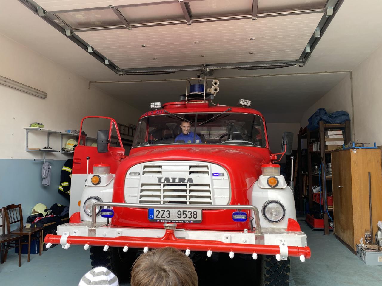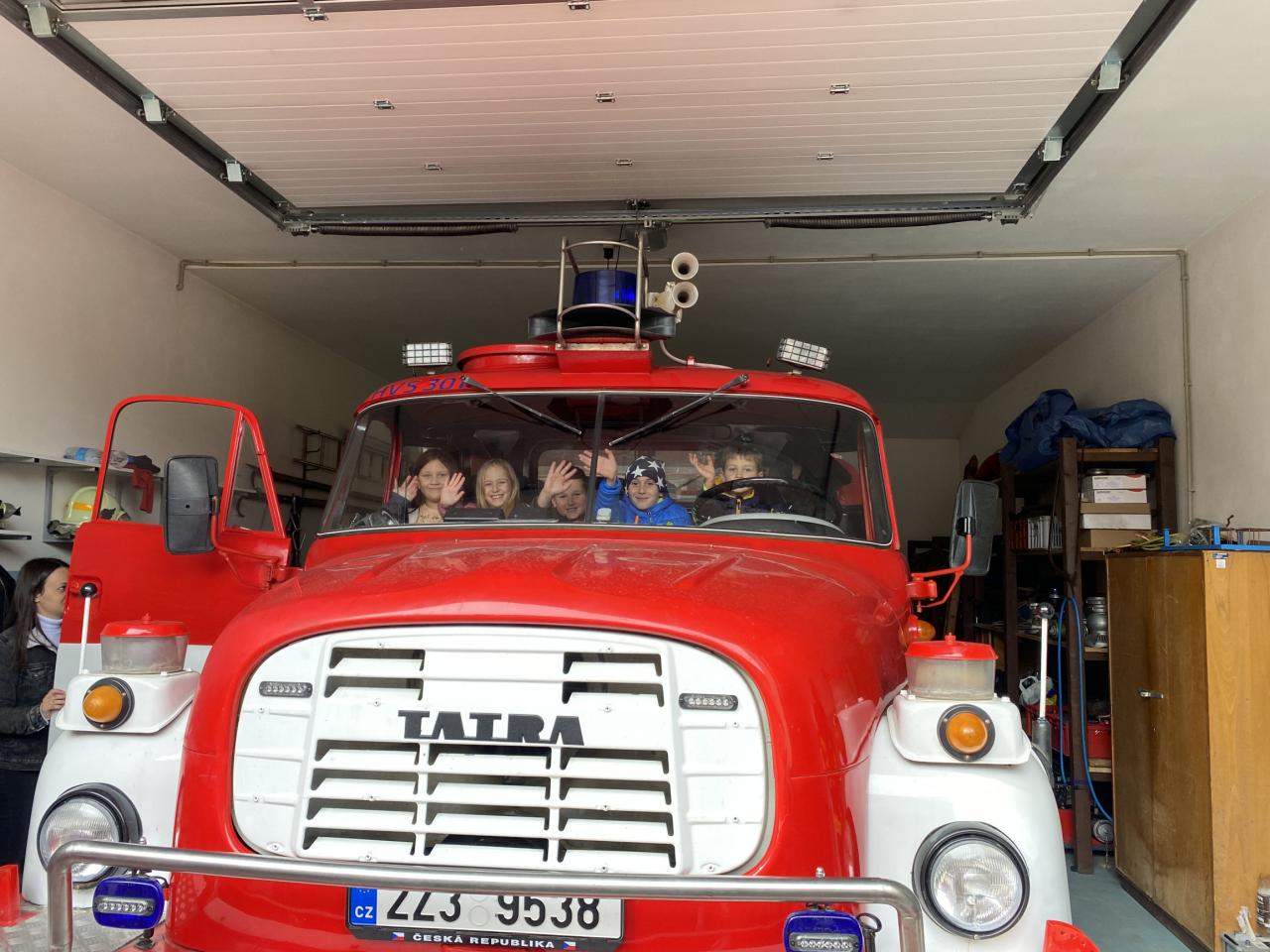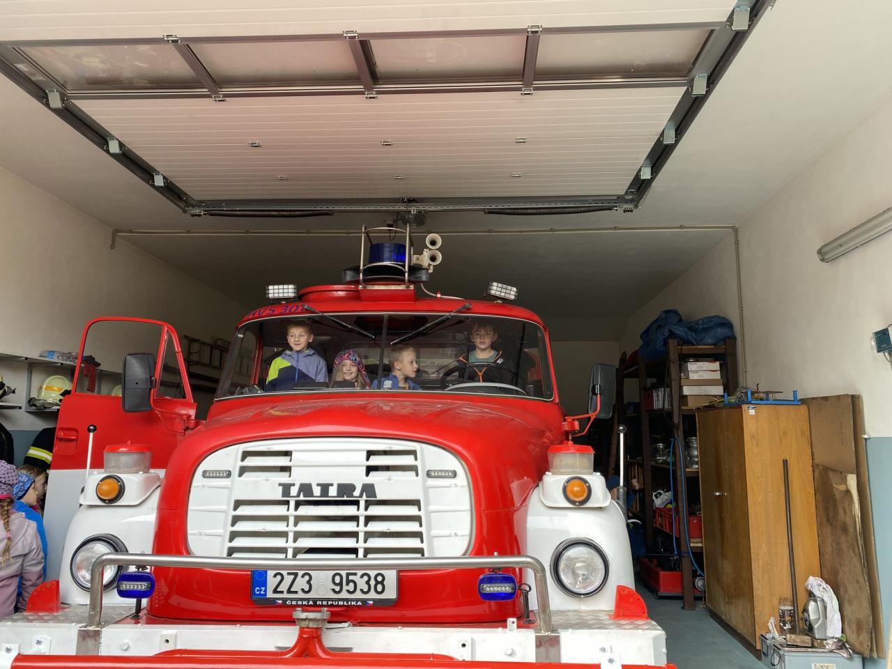 Návštěva hasičárny, ukázka hasičského auta, projížďka v hasičském autě, ukázka hasičských pomůcek